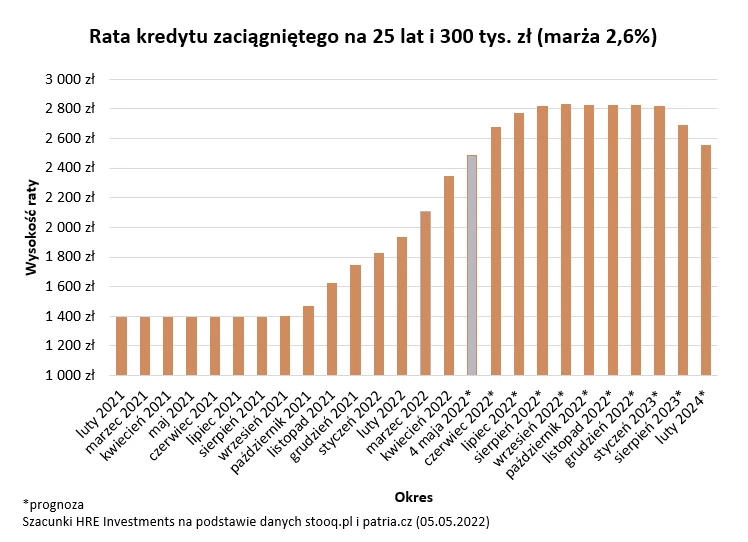 Niestety wszystko wskazuje na to, że majowa decyzja RPP wciąż nie zakończy cyklu podwyżek. Prognozy odnośnie tego jak wysoko poszybuje koszt pieniądza w Polsce zmieniają się ostatnio z miesiąca na miesiąc, a nawet z tygodnia na tydzień. Na początku maja 2022 roku z kontraktów terminowych na stopę procentową wynika, że stopa referencyjna (główna) w bieżącym roku może wynieść 7-7,5 proc. Jeśli tak się stanie, to rata może pójść w górę jeszcze o dodatkowe 10-15 proc. Jeśli szukać jakiegoś drobnego pocieszenia, to już w 2023 roku można spodziewać się tego, że koszt pieniądza, a więc też raty kredytów, mogą powoli zacząć spadać. Tak przynajmniej sugerują bieżące prognozy.