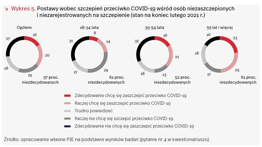 Dziś PIE publikuje specjalny raport "Od szczepionek do szczepień. Jak skutecznie włączać społeczeństwo w walkę z pandemią?". W badaniu wyodrębniono 4 grupy postaw. 35 proc. badanych to osoby zaszczepione lub zarejestrowane na szczepienie. Wśród pozostałych 65 proc. niezaszczepionych i niezarejestrowanych występują 3 podgrupy: niezdecydowani (37 proc.), przeciwni szczepieniom (18 proc.) oraz przekonani o konieczności lub słuszności szczepienia (10 proc.).
