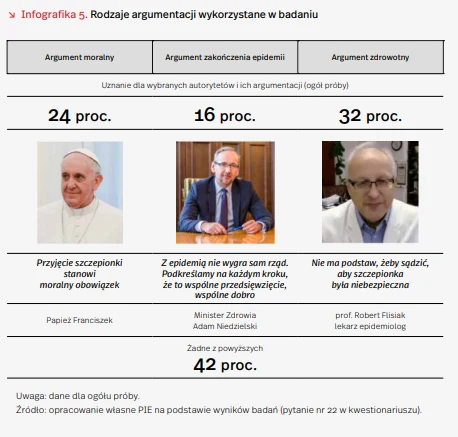 Osoby uwzględniające w swoich opiniach głosy autorytetów przede wszystkim chcą słuchać lekarza epidemiologa, a tym samym argumentacji o bezpieczeństwie szczepionki (32 proc.). Blisko 1/4 skłania się również ku argumentacji moralnej wyrażanej głosem głowy Kościoła katolickiego. Argument zakończenia pandemii, na który powołuje się minister zdrowia, spotkał się z najniższym uznaniem (16 proc.). Nieco ponad 40 proc. osób zadeklarowało brak przekonania do jakiejkolwiek linii argumentacji.