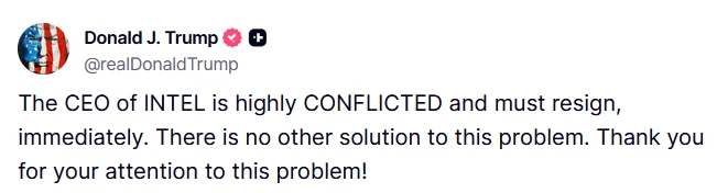 "Prezes Intela jest w głębokim konflikcie i musi natychmiast ustąpić. Nie ma innego rozwiązania tego problemu" - napisał Trump na swojej platformie Truth Social.