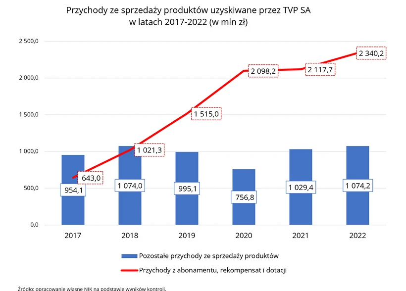 Przytoczmy, co o utrzymywanym przez wiele lat systemie rekompensat napisała NIK. "Model gospodarki finansowej TVP SA od 2017 r. jest oparty na współfinansowaniu działalności ze środków budżetu państwa w postaci rekompensat abonamentowych (...) Łącznie w latach 2017-2022 TVP SA otrzymała rekompensaty z budżetu państwa w kwocie 7 196,2 mln zł (7,2 mld zł), a w 2023 r. 2 347,9 mln zł (2,3 mld zł). Systematycznie wzrastały również przychody z tytułu otrzymanych dotacji z 21,3 mln zł w 2017 r. do 258,4 mln zł w 2022 r."