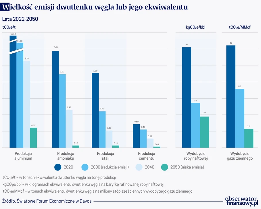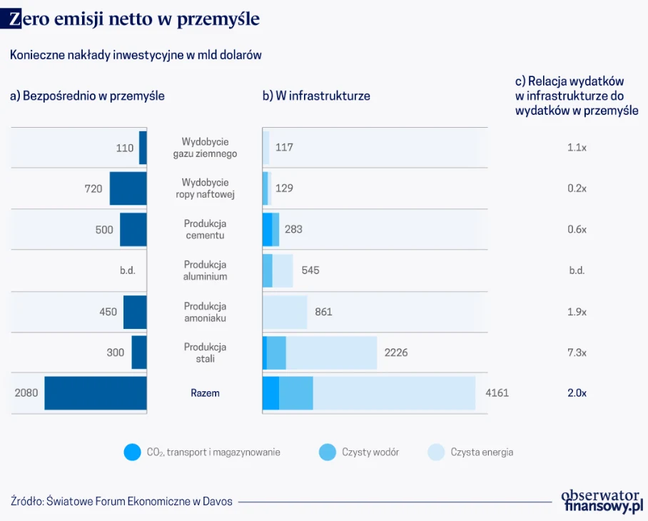 W innych dziedzinach koszty inwestycyjne będą niższe, ale także idące w dziesiątki i setki miliardy dolarów. W przypadku cementu eksperci z Forum w Davos szacują je na 75 do 140 mld dol. na instalacje produkcji wodoru i 110 do 240 mld dol. na CCUS. Nie mniej niż 510 mld dolarów musiałyby pochłonąć podobne technicznie rozwiązania zastosowane w produkcji aluminium. Spodziewane koszty budowy infrastruktury potrzebnej do produkcji "zielonego" amoniaku to niej mniej niż 850 mld dol. i 450 mld dol. w samym przemyśle.