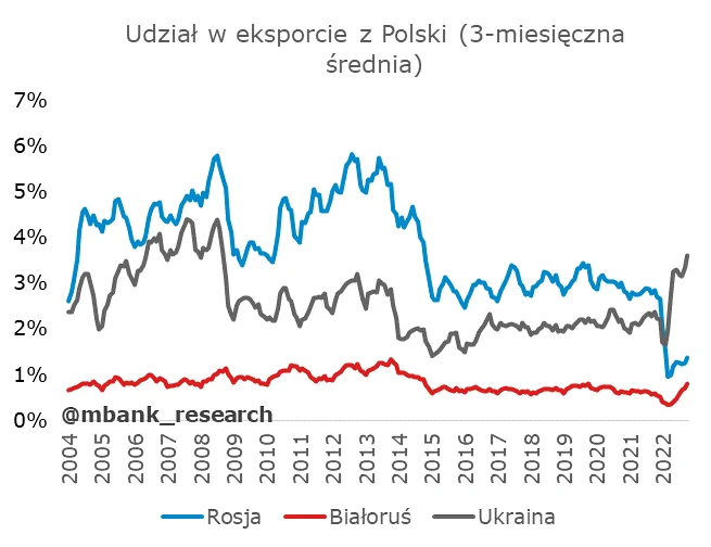 Ten wykres opowiada dwie lub nawet trzy historie. Po pierwsze, widać tąpniecie udziału eksportu do Rosji po wybuchu wojny i po nałożeniu sankcji. Po drugie, ten deficyt został w zasadzie pokryty zwiększonym eksportem do Ukrainy (oraz po części też do Białorusi), co jest o tyle ciekawe, że w białoruskiej propagandzie wciąż cyrkulują treści o tym, jakoby Polska stała i czekała na towary z Białorusi. A jest zupełnie odwrotnie - i to jest ta trzecia historia.