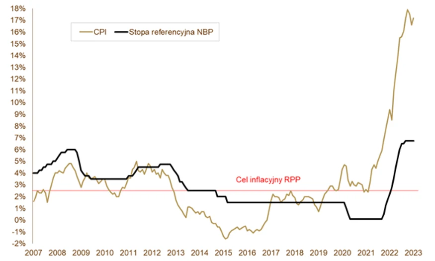 Inflacja CPI (konsumencka) doszła do poziomu 17,9 proc., najwyższego od 1996 roku. Rada Polityki Pieniężnej nie mogła pozostać obojętna na taką dynamikę cen i kontynuowała cykl zacieśniania polityki monetarnej. Jedenaście kolejnych posiedzeń zakończyło się podwyżkami stóp procentowych. Obecnie stopy są na poziomie 6,75 proc., niewidzianym od 20 lat.
