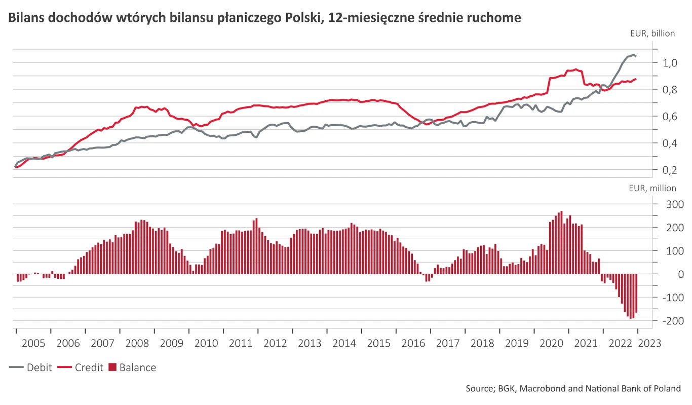 - Transfery z Polski (dochody wtórne - debit) są po raz pierwszy trwale i znacząco większe o transferów do Polski (dochody wtórne - credit) - zauważa Mateusz Walewski, główny ekonomista Banku Gospodarstwa Krajowego.