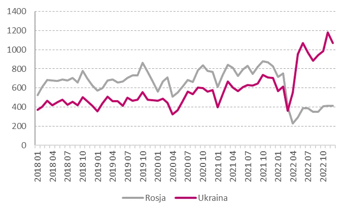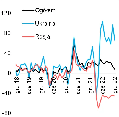 - Jednak w przypadku Ukrainy równie szybko wartość wysyłanych tam towarów odbiła, a jej dynamika utrzymuje się teraz na ok. 80 proc. r/r. To m.in. efekt wsparcia międzynarodowego jakie ten kraj dostaje od Polski i tranzytem przez Polskę. Tymczasem załamanie w eksporcie do Rosji wciąż się utrzymuje - dodaje.