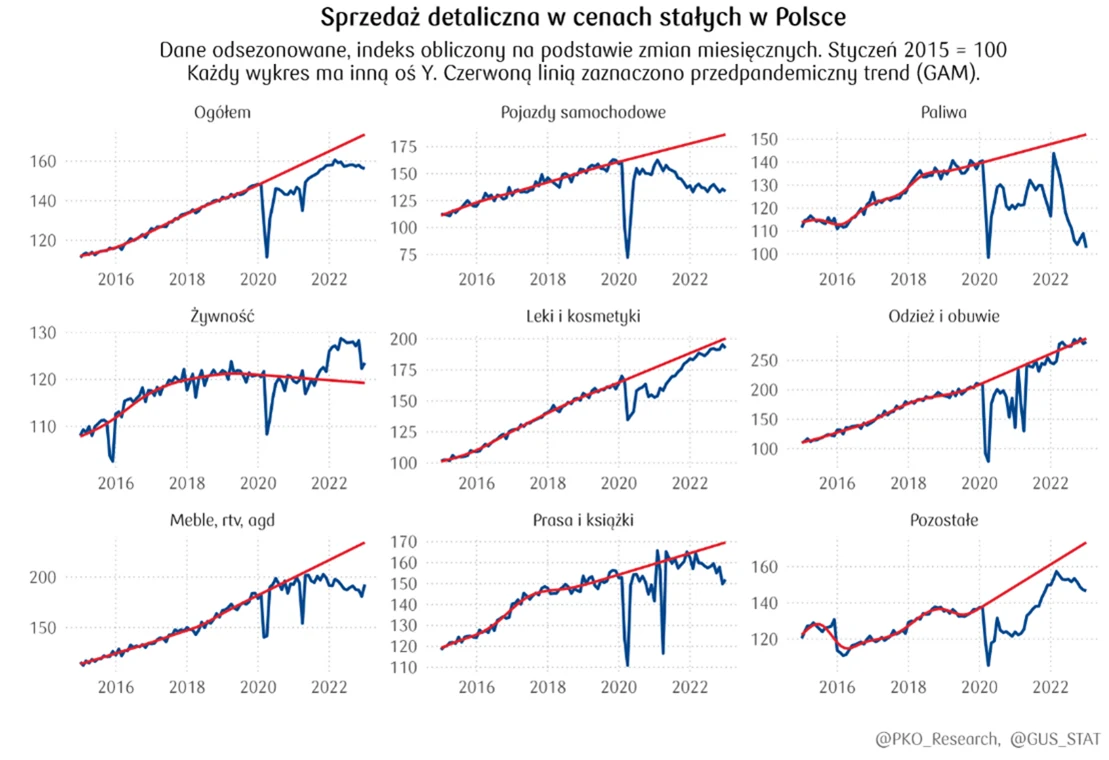 - Szacujemy, że realne wzrosty sprzedaży detalicznej w drugiej połowie 2022 zostały osiągnięte jedynie dzięki wydatkom uchodźców. W styczniu spadek sprzedaży był widoczny już niemalże we wszystkich kategoriach, w tym w żywności - zauważa Anna Wojtyniak.