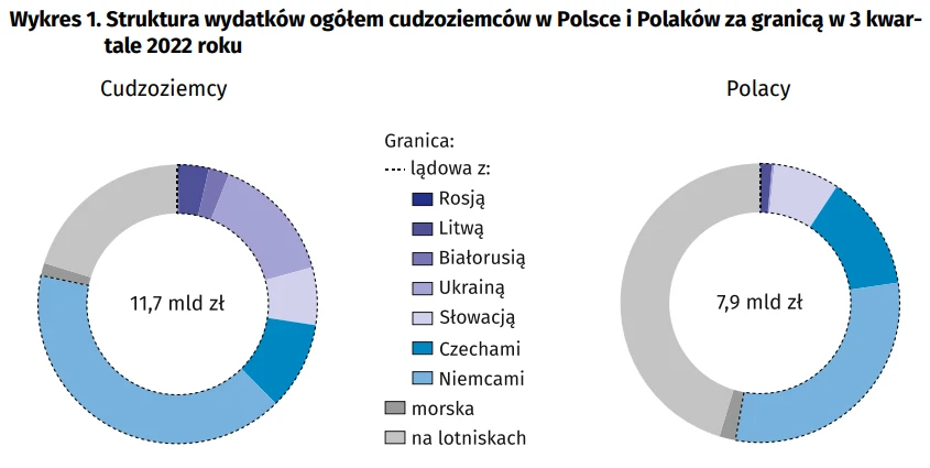 Patrząc na to, kto zostawiał w naszym kraju najwięcej, to w trzecim kwartale 2022 r. największy udział w strukturze zakupów miały osoby przekraczające granicę z Niemcami (4,7 mld zł), a następnie z Ukrainą (1,7 mld zł), Czechami (1,19 mld zł), Słowacją (782 mln zł), Litwą (399 mln zł), Białorusią (276 mln zł). Udział Rosji był marginalny (23 mln zł).