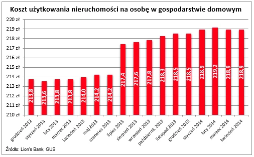 Na utrzymanie mieszkania, podobnie jak w przypadku koszyka inflacji, składają się koszty eksploatacyjne, energii i wody. W kwietniu ceny pozostały na poziomie z marca, natomiast w stosunku rocznym podniosły się o 2,1 proc. Z wyliczeń Lion's Banku wynika, że na utrzymanie mieszkanie czteroosobowa rodzina wydaje dziś 876 zł. W ujęciu rocznym koszt ten wzrósł o 20 zł, co w dalszym ciągu jest konsekwencją podwyżek stawek za wywóz śmieci z lipca 2013 r.