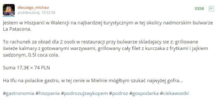 Mężczyzna nie krył oburzenia, że w porównaniu z cenami w restauracjach i barach w Polsce, wakacje w Hiszpanii mogą okazać się tańsze. "W tej cenie w Mielnie mógłbym szukać najwyżej gofra" - napisał internauta.