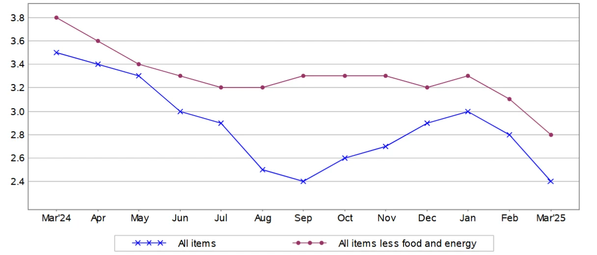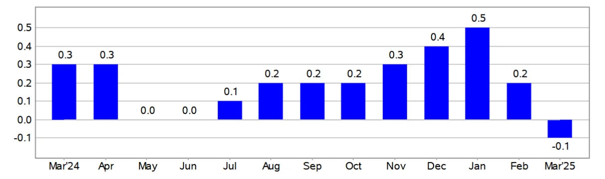 Indeks cen konsumpcyjnych (...) spadł o 0,1 procenta w marcu po uwzględnieniu czynników sezonowych, po wzroście o 0,2 procent w lutym, poinformowało dziś Biuro Statystyki Pracy USA (Bureau of Labor Statistics). Dla 12 ostatnich miesięcy indeks wszystkich pozycji wzrósł o 2,4 proc. - czytamy w komunikacie BLS.
