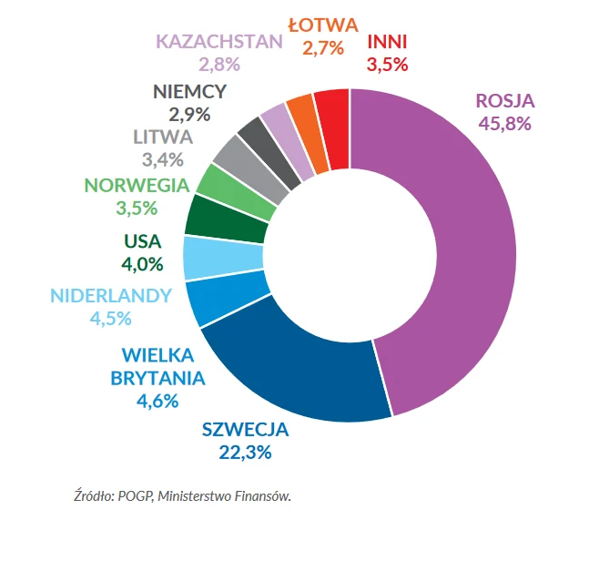 Wykres. Główni dostawcy LPG do Polski w 2023 r. (w proc.). Źródło: POGP