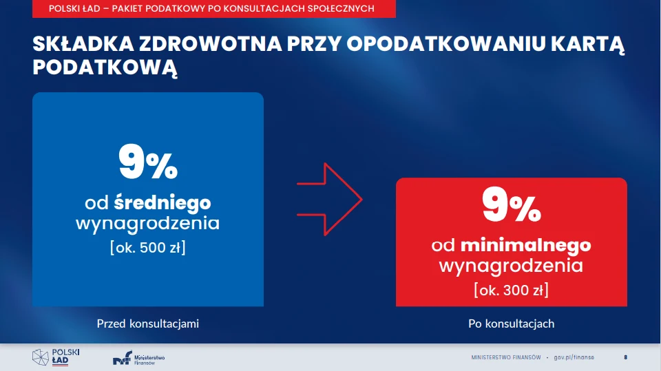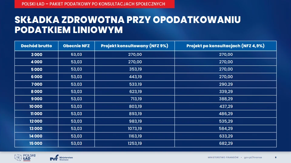 W skrócie obecnie wygląda to tak, że w przypadku etatowców składka zdrowotna wyniesie 9 proc. (z tym, że ich obejmie tzw. ulga dla klasy średniej i korzystają z kwoty wolnej od podatku). Dla przedsiębiorców opodatkowanych według skali zostaje stawka z pierwotnego projektu czyli 9 proc. dochodu bez możliwości odliczenia od podatku. W przypadku liniowców składka zdrowotna wyniesie 4,9 proc., ale co najmniej 9 proc. minimalnego wynagrodzenia czyli minimum 270 zł. To oznacza, że przykładowo przy 8 tys. zł dochodu płaciliby według pierwotnego projektu 623 zł składki, a według propozycji po zmianach będzie to 339 zł. Przy 11 tys. dochodu będzie to nie 893 zł - jak w pierwszym projekcie - ale 486 zł.