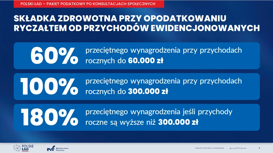 Dla ryczałtowców składka będzie liczona jeszcze inaczej. Przy przychodach do 60 tys. zł będzie to 9 proc. od 60 proc. przeciętnego wynagrodzenia, od 100 proc. przeciętnego wynagrodzenia dla przychodów do 300 tys. zł, a przy wyższym przychodzie będzie liczona od 180 proc. przeciętnego wynagrodzenia. Dla karty podatkowej będzie to 9 proc. liczone od minimalnego wynagrodzenia czyli około 300 zł. Przedsiębiorców nie obejmuje ulga dla klasy średniej, z której mogą korzystać tylko pracownicy.