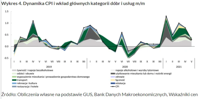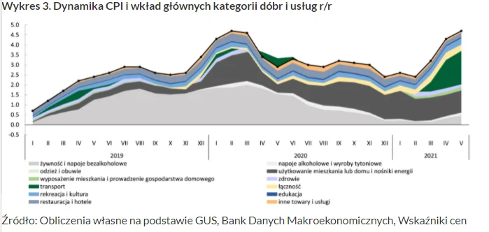 W maju 2021 inflacja w Polsce zrosła o 4,7 proc. w stosunku do analogicznego okresu roku poprzedniego z czego za 1,65 proc. wzrostu odpowiadają ceny transportu w tym cen paliw, 1,32 proc. ceny użytkowania mieszkań w tym nośników energii, 0,32 proc. wzrost cen łączności, 0,32 proc. wzrost cen rekreacji i kultury, 0,22 proc. wzrost cen usług restauracji i hoteli.