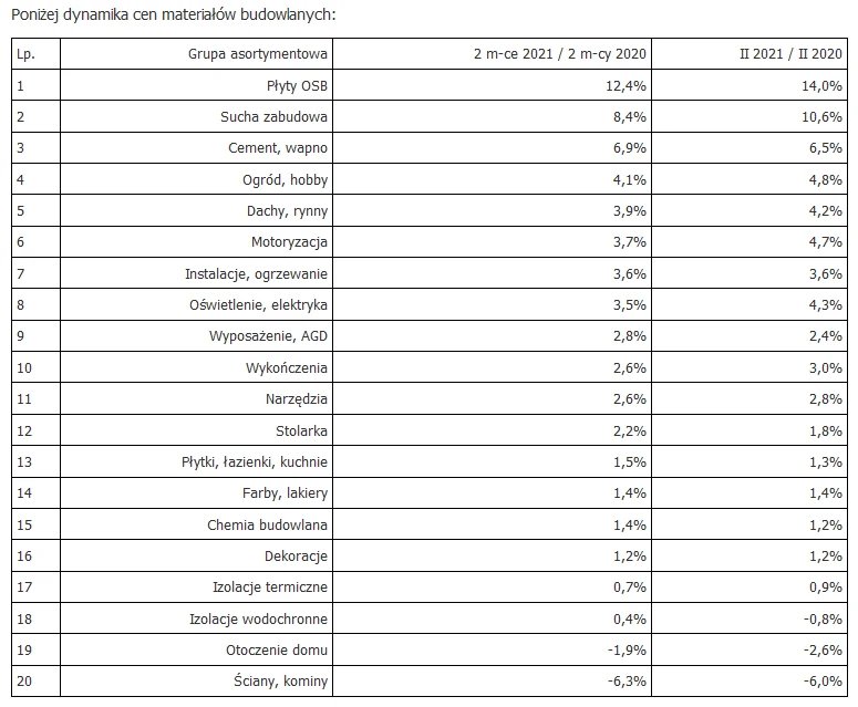 Dynamika cen materiałów budowlanych w minionym roku wyniosła średnio +1,4 proc.. Jak pokazuje analiza grupy PSB, z ujemną dynamiką sprzedaży uplasowały się w rankingu jedynie trzy grupy: sucha zabudowa -0,2 proc. (ceny wzrosły o 2,1 proc.), ściany, kominy -6,1 proc. (ceny spadły o 1,2 proc.) oraz izolacje termiczne -6,8 proc. (przy spadku cen o 3,3 proc.). Najwyższą dynamikę cenową odnotowały produkty z grupy cement, wapno +7 proc., a najniższą płyty OSB -4,7 proc..