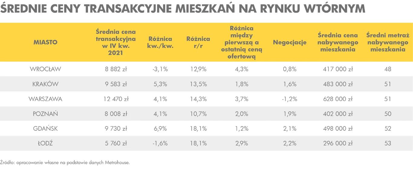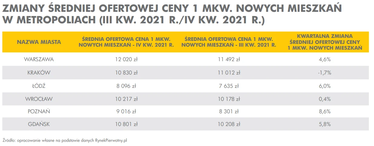 W dużych miastach, analizowanych w raporcie, mówimy o wzrostach cen sięgających kilkunastu procent w odniesieniu do analogicznej sytuacji sprzed dwunastu miesięcy. Na rynku wtórnym rekordzistami wzrostów są Gdańsk i Łódź (po 18,1 proc.). W Gdańsku ceny nabywanych mieszkań wyprzedziły już Kraków, który zwykle zajmował drugie miejsce w zestawieniach najdroższych metropolii w Polsce. Średnia cena powyżej 10 tys. zł za m kw. występuje na razie tylko w Warszawie, gdzie po kolejnych zwyżkach osiągnęła poziom już prawie 12,5 tys. zł za m kw.