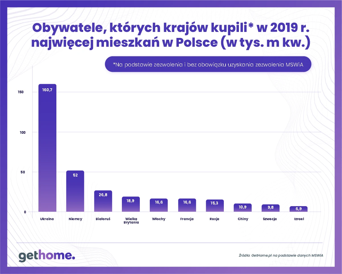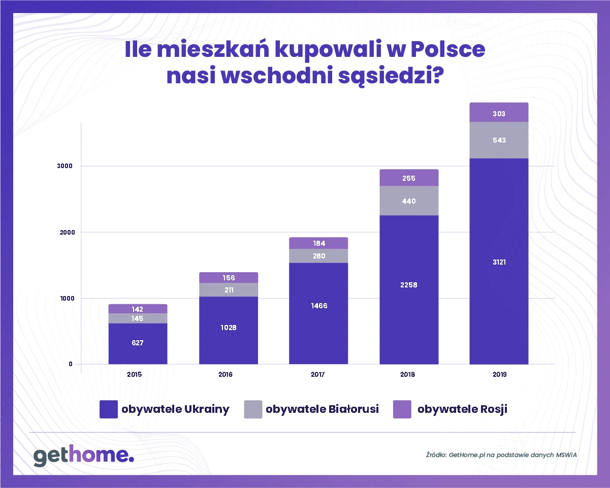 Ponadto w 2019 r. Ukraińcy kupili w naszym kraju przeszło 3,2 tys. mieszkań. Wśród cudzoziemców kupujących u nas mieszkania jest też coraz więcej Białorusinów i Rosjan.