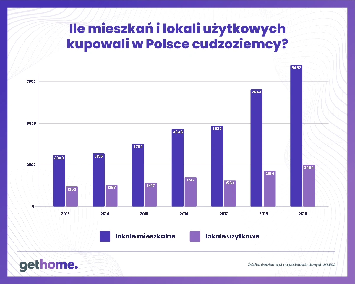 W 2019 r. wszyscy cudzoziemcy kupili w Polsce 8,5 tys. mieszkań. To mniej więcej tyle, ile deweloperzy wybudowali ich w Łodzi i Poznaniu razem wziętych. Co ciekawe przeciętne powierzchnia tych mieszkań wynosiła 57,5 m kw.