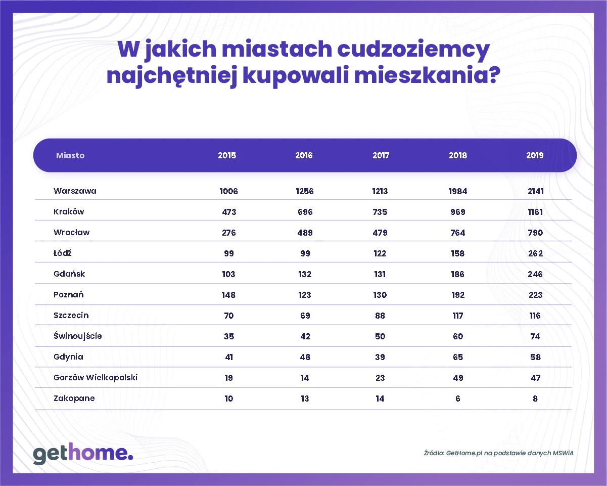 Widać też wyraźnie, że cudzoziemcy najchętniej kupują mieszkania tam, gdzie najłatwiej jest o pracę, czyli w Warszawie, Krakowie, Wrocławiu, Poznaniu i Gdańsku.