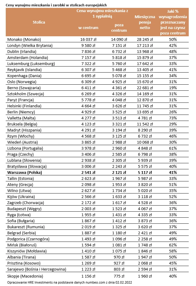 Dla wielu pewnie będzie to nikłe pocieszenie, ale w 22 innych metropoliach Europy stawki te są wyższe niż w stolicy naszego kraju. Innymi słowy w miastach tych musielibyśmy płacić więcej gospodarzowi naszego wynajmowanego mieszkania. W gronie droższych miast znajdziemy stolice m.in. krajów skandynawskich, krajów Beneluxu, niektóre państwa basenu morza Śródziemnego, ale i Pragę czy Bratysławę. Z drugiej strony mamy natomiast 17 stolic, gdzie najem kosztowałby nas mniej. W gronie tańszych miejsc znalazły się głównie stolice państw bałkańskich, bałtyckich oraz przykładowo Ateny, Budapeszt, Mińsk, Kijów czy Kiszyniów.