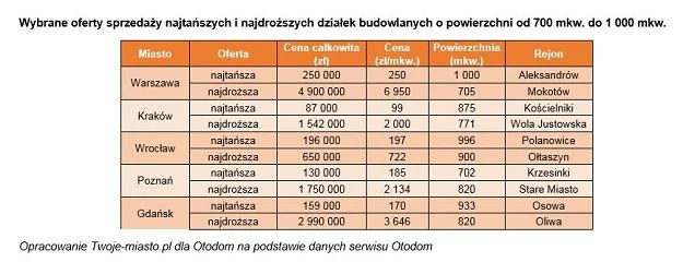 Najtańsza działka w stolicy, o powierzchni 1000 m kw. wyceniana jest na ćwierć mln zł. W pozostałych miastach jest taniej. W Krakowie 875 m kw. gruntu na Kościelnikach kosztuje 87 tys. zł. Jeśli chodzi o najdroższe działki, to drugie miejsce, za Warszawą zajmuje Gdańsk. 820 m kw. w Oliwie jest do wzięcia za bagatela 2,99 mln zł.