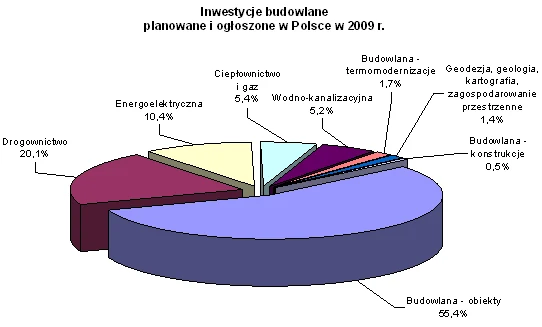 W okresie od stycznia do grudnia 2009 roku w Polsce poinformowano o 6713 nowych inwestycjach z szeroko pojmowanej branży budowlanej (w tym znaczeniu, do branży budowlanej, zaliczone zostały inwestycje dotyczące: obiektów budowlanych, konstrukcji, drogownictwa, termomodernizacji, robót geodezyjnych, wodno-kanalizacyjnych, energoelektrycznych, oraz ciepłownictwa i gazu).