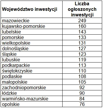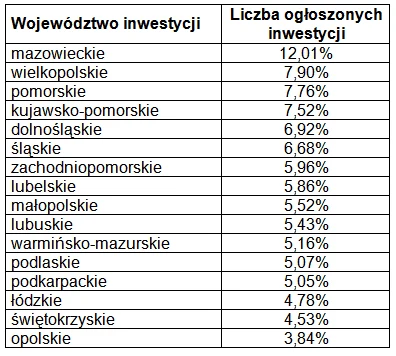 W analizowanym okresie najwięcej planów inwestycyjnych ogłoszono w województwie mazowieckim (12,01 proc. inwestycji) oraz wielkopolskim (7,90 proc. inwestycji), pomorskim (7,76 proc. inwestycji) kujawsko-pomorskim (7,52 proc. inwestycji). Natomiast najmniej inwestycji zaplanowano w województwie opolskim (3,84 proc. inwestycji). Szczegółowe zestawienie rodzaju inwestycji z rozbiciem na poszczególne województwa znajduje się w tabeli poniżej.