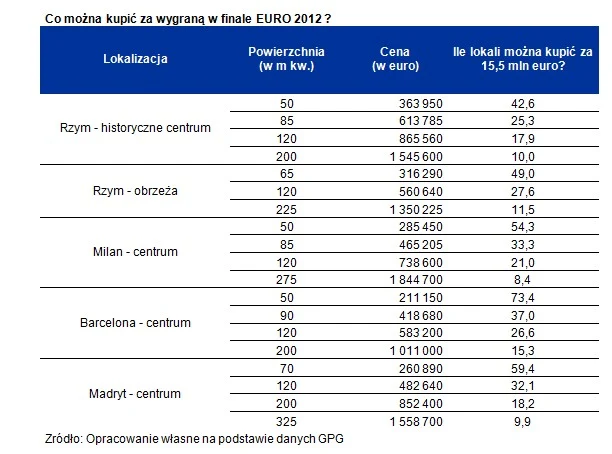 Łączna pula wygranych za awans do finału i niedzielny triumf to 15,5 mln zł. Zgodnie z danymi Global Property Guide ta niebagatelna suma pozwoliłaby Włochom na zakup 18 apartamentów o powierzchni 120 m kw. w historycznym centrum Rzymu. Na znacznie więcej mogliby sobie pozwolić Hiszpanie. Gdyby całą pulę za wygraną w EURO 2012 przeznaczyli wspólnie na zakup apartamentów w centrum swojej stolicy, to stać ich by było na prawie 27 nieruchomości o powierzchni 120 m kw. każda. Włosi, aby kupić podobną liczbę apartamentów w swojej stolicy musieliby szukać apartamentów na obrzeżach Rzymu. Wtedy za 15,5 mln euro mogliby kupić prawie 28 apartamentów o powierzchni 120 mkw. każdy.