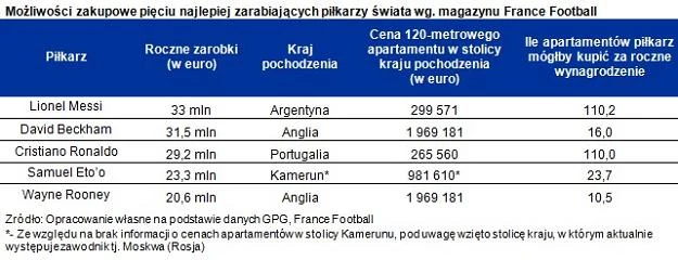 W centrum Londynu za 120 m kw. lokalu w najwyższym standardzie trzeba bowiem zapłacić równowartość prawie 2 mln euro, a w Moskwie, którą mógłby być zainteresowany Kameruńczyk Samuel Eto'o (aktualnie występuje w rosyjskim klubie Anża Machaczkała, który jest własnością rosyjskiego potentata paliwowego) jest to równowartość prawie miliona euro. W efekcie Rooney mógłby sobie kupić w Londynie prawie 11, Beckham 16, a Eto'o w Moskwie niecałe 24 apartamenty o powierzchni 120 m kw.