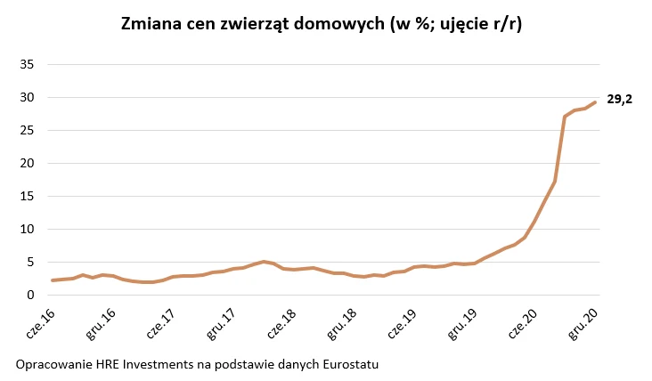 I tak na przykład sporym zaskoczeniem jest duże zainteresowanie zwierzętami domowymi. Wszystko wskazuje na to, że w tych niecodziennych czasach po prostu zapragnęliśmy mieć pupila. I nie był to jedynie trend związany z ograniczeniem w przemieszczaniu się, w ramach którego posiadanie psa stanowiło żelazny glejt. Sytuacja utrzymuje się już bowiem od kilku miesięcy. Efekt jest taki, że w grudniu 2020 r. ceny zwierząt domowych były w Polsce o ponad 29% wyższe niż rok wcześniej - wynika ze szczegółowych danych Eurostatu na temat zmian cen.
