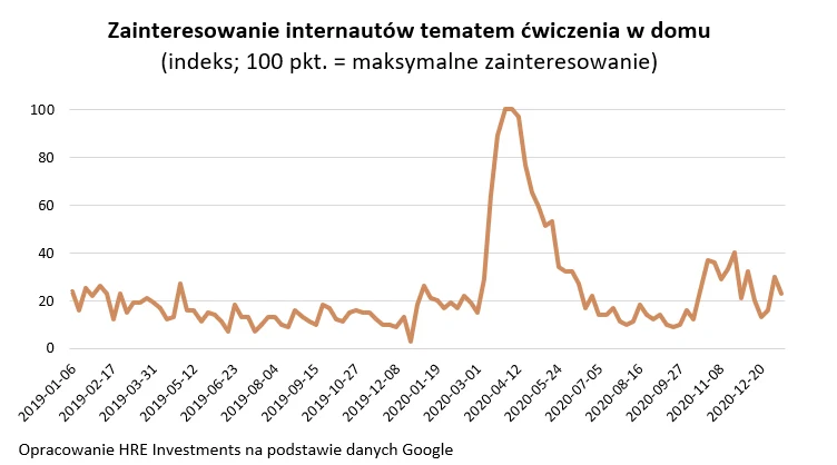 Niestety w tym samym badaniu Firstbeat sugeruje, że mniej się ruszamy. Mniej wychodzimy z domu, a więc też wzrosło grono osób wykonujących mniej niż tysiąc kroków dziennie. To ma oczywiście szereg negatywnych konsekwencji. Ale nawet w ich gąszczu możemy znaleźć choć jedną pozytywną zmianę - częściej dbamy o kondycję w domu. W Polsce zainteresowanie tym tematem szczególnie mocno wzrastało przy okazji zamykania siłowni czy basenów. Doskonale obrazują to dane Google. W całym 2020 roku frazę "ćwiczenie w domu" wyszukiwaliśmy ponad dwa razy częściej niż w 2019 roku.