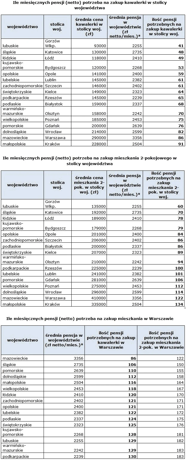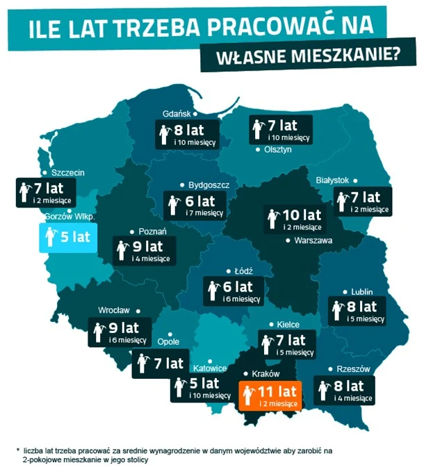 W korzystnej sytuacji są osoby pracujące na Mazowszu ale zainteresowane zakupem mieszkania 1-pokojowego w Gorzowie Wlkp. Z najwyższym w skali kraju średnim wynagrodzeniem (3356 zł) mogą zrealizować swój cel już po 2 latach i 3 miesiącach oszczędzania. W zupełnie innym położeniu są Ci, którzy planują zakup mieszkania w Warszawie ale dochody czerpią z pracy na Podkarpaciu; na kawalerkę w stolicy muszą przeznaczyć aż 130 średnich pensji, tj. zarobki z blisko 11 lat.