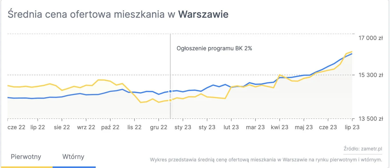 W okresie od ogłoszenia programu Bezpieczny kredyt 2 proc. do końca czerwca ceny nieruchomości w Warszawie na rynku pierwotnym wzrosły o 8,4 proc., a na rynku wtórnym o 6,6 proc. Dla analogicznego okresu sprzed ogłoszenia programu Bezpieczny kredyt 2 proc. ceny mieszkań na rynku pierwotnym spadły o 3,9 proc., a na rynku wtórnym wzrosły jedynie o 1,8 proc.