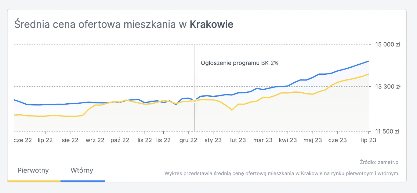 W okresie od ogłoszenia programu Bezpieczny kredyt 2 proc. do końca czerwca ceny mieszkań w Krakowie na rynku pierwotnym wzrosły o 6 proc., a na rynku wtórnym o 9,5 proc. Przed ogłoszeniem programu ceny mieszkań na rynku pierwotnym rosły o 4,7 proc., a na rynku wtórnym wzrosły jedynie o 1,2 proc.