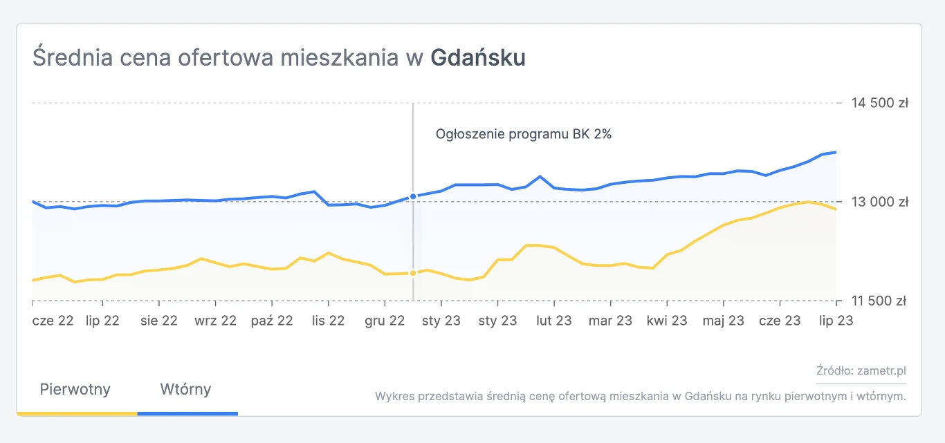 Przed zapowiedzią programu, od lipca do grudnia 2022 r., w niecałych 3,6 tys. ogłoszeniach w Gdańsku obniżono cenę, przy 0,9 tys. ofert, gdzie cena wzrosła. W następnym półroczu widać wyraźne odwrócenie trendu. Liczba ogłoszeń ze spadkiem ceny zmniejszyła się o 28 proc. do 2,6 tys. ofert, natomiast liczba podwyżek wzrosła o 38 proc., do ponad 1,2 tys. ofert.
