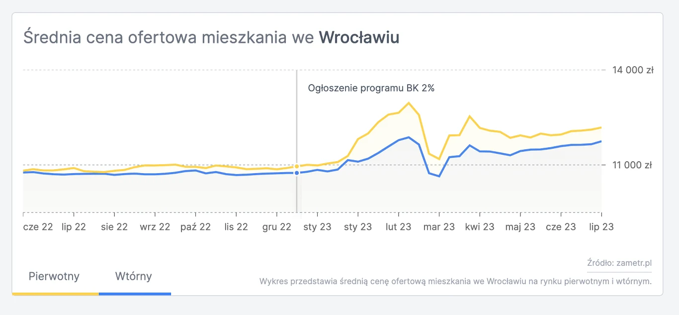 W okresie od ogłoszenia programu dopłat do kredytów do końca czerwca ceny mieszkań we Wrocławiu na rynku pierwotnym wzrosły o 9,5 proc., a na rynku wtórnym o 7,5 proc. Dla analogicznego okresu sprzed zapowiedzi ceny mieszkań na rynku pierwotnym rosły jedynie o 0,7 proc., a na rynku wtórnym wzrost był na poziomie 0,4 proc. Sytuacja w pozostałych dużych miastach potwierdza podobną tendencję.