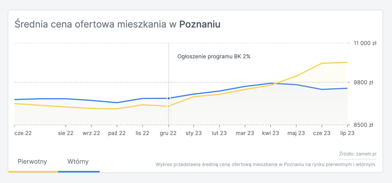 Po zapowiedzi preferencyjnych kredytów do końca czerwca ceny mieszkań w Poznaniu na rynku pierwotnym wzrosły aż o 14,4 proc., a na rynku wtórnym o 2,9 proc. Dla analogicznego okresu sprzed ogłoszenia programu ceny mieszkań na rynku pierwotnym zanotowały spadek o 0,3 proc., a na rynku wtórnym wzrost był na poziomie jedynie 0,2 proc.