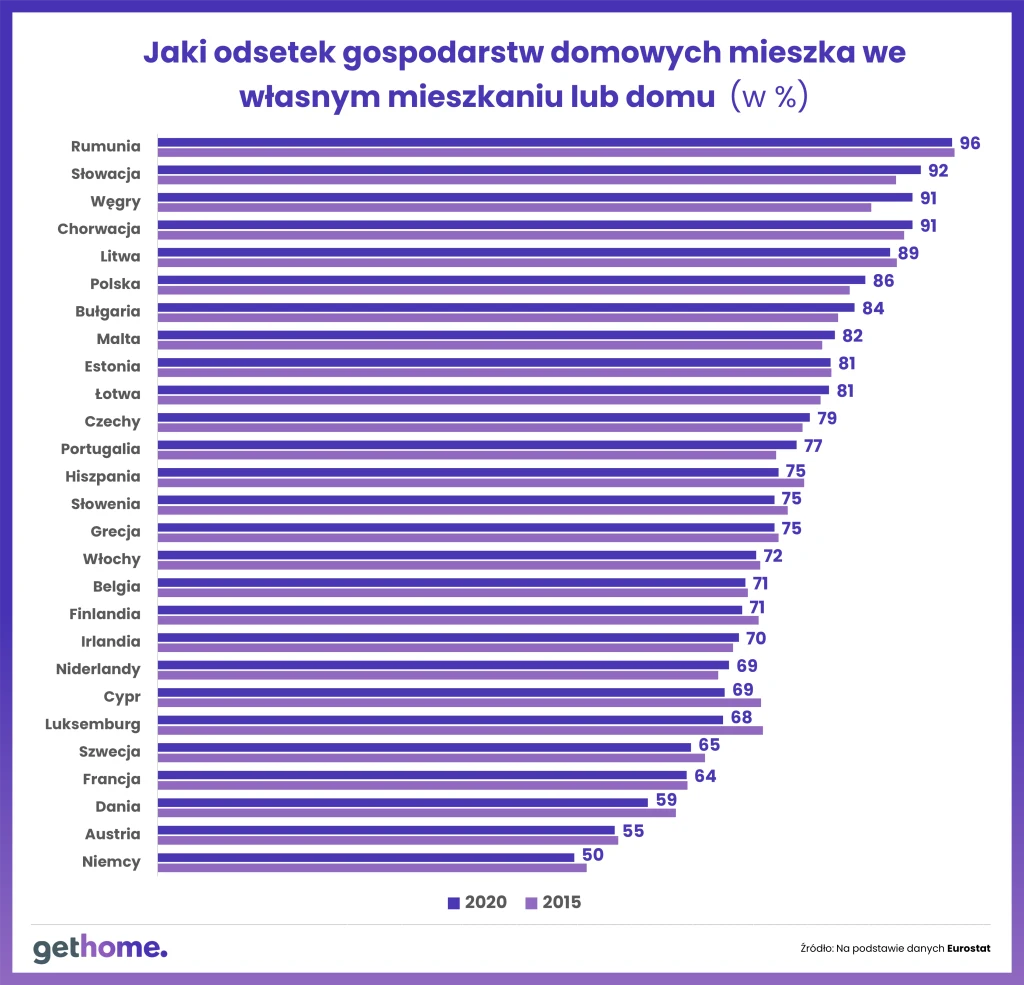 Lepiej jest mieszkać we własnym niż w najętym mieszkaniu lub domu - takiego zdania jest blisko 70 proc. gospodarstw domowych zamieszkujących UE. Pozostałe są najemcami. Z danych Eurostatu wynika, że w 2020 r. najwyższy udział własności był w Rumunii, na Słowacji, w Chorwacji i na Węgrzech. W tych krajach ponad 90 proc. mieszkańców posiada swój dom lub mieszkanie. Na drugim biegunie są Niemcy, gdzie przeszło połowa populacji to najemcy. Wysoki odsetek gospodarstw domowych najmujących mieszkania i domy jest także w Austrii i Danii.