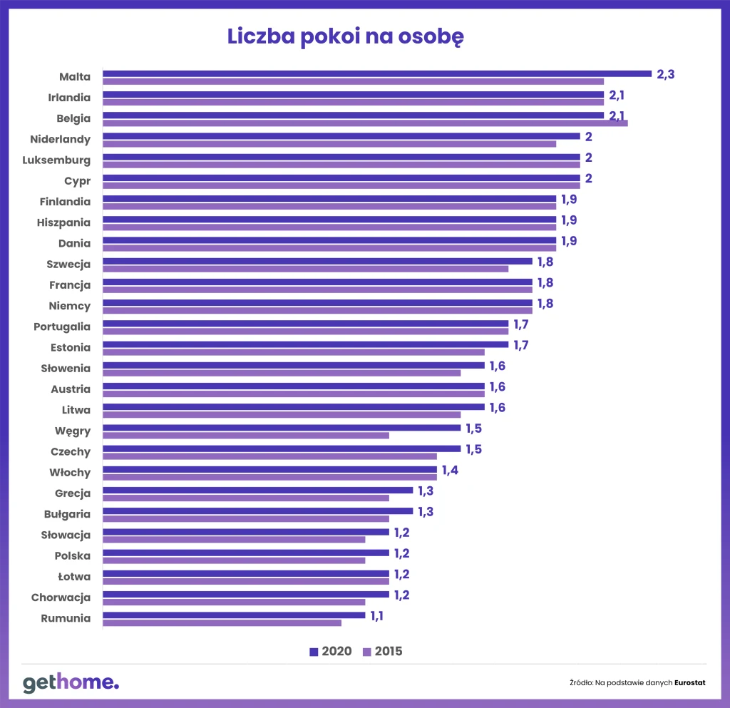 Jednym z mierników stosowanych przez Eurostat jest wskaźnik pokazujący liczbę pokoi przypadających na jednego obywatela danego kraju. W Polsce na każdego mieszkańca przypadało w 2020 r. 1,2 pokoju, co jest jednym z najgorszych wyników w całej UE, gdzie średnia to 1,6 pokoju. Gorzej lub podobnie jak u nas jest jeszcze w Rumunii, Chorwacji, Słowacji i na Łotwie. Na drugim biegunie są takie kraje jak Malta, Belgia i Irlandia, gdzie na osobę przypadają przeszło dwa pokoje.