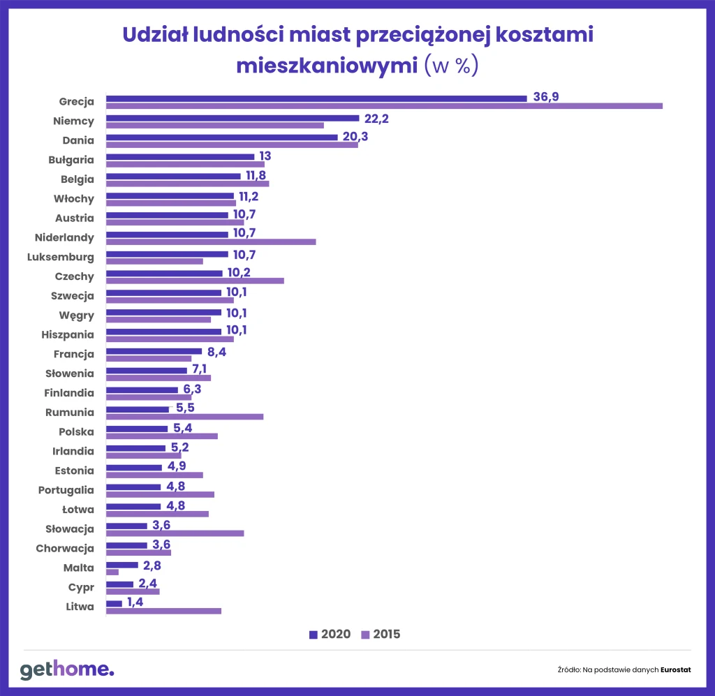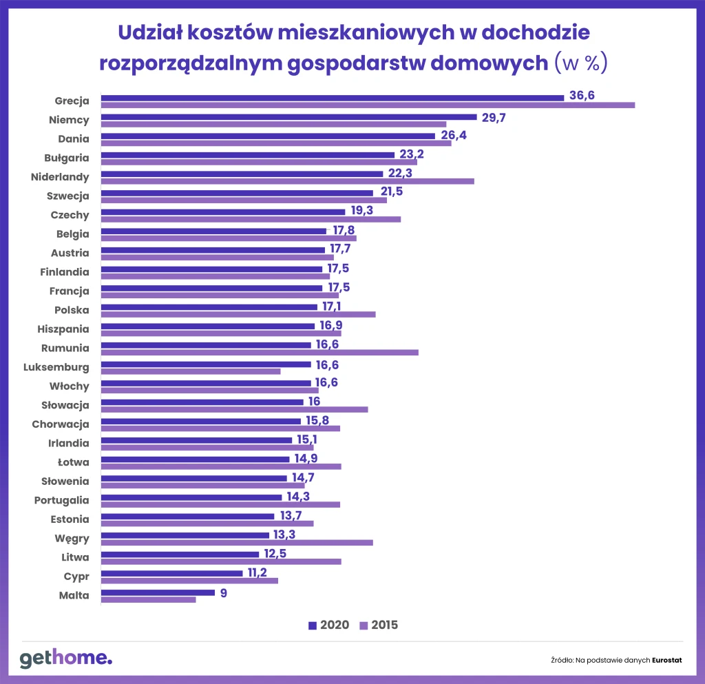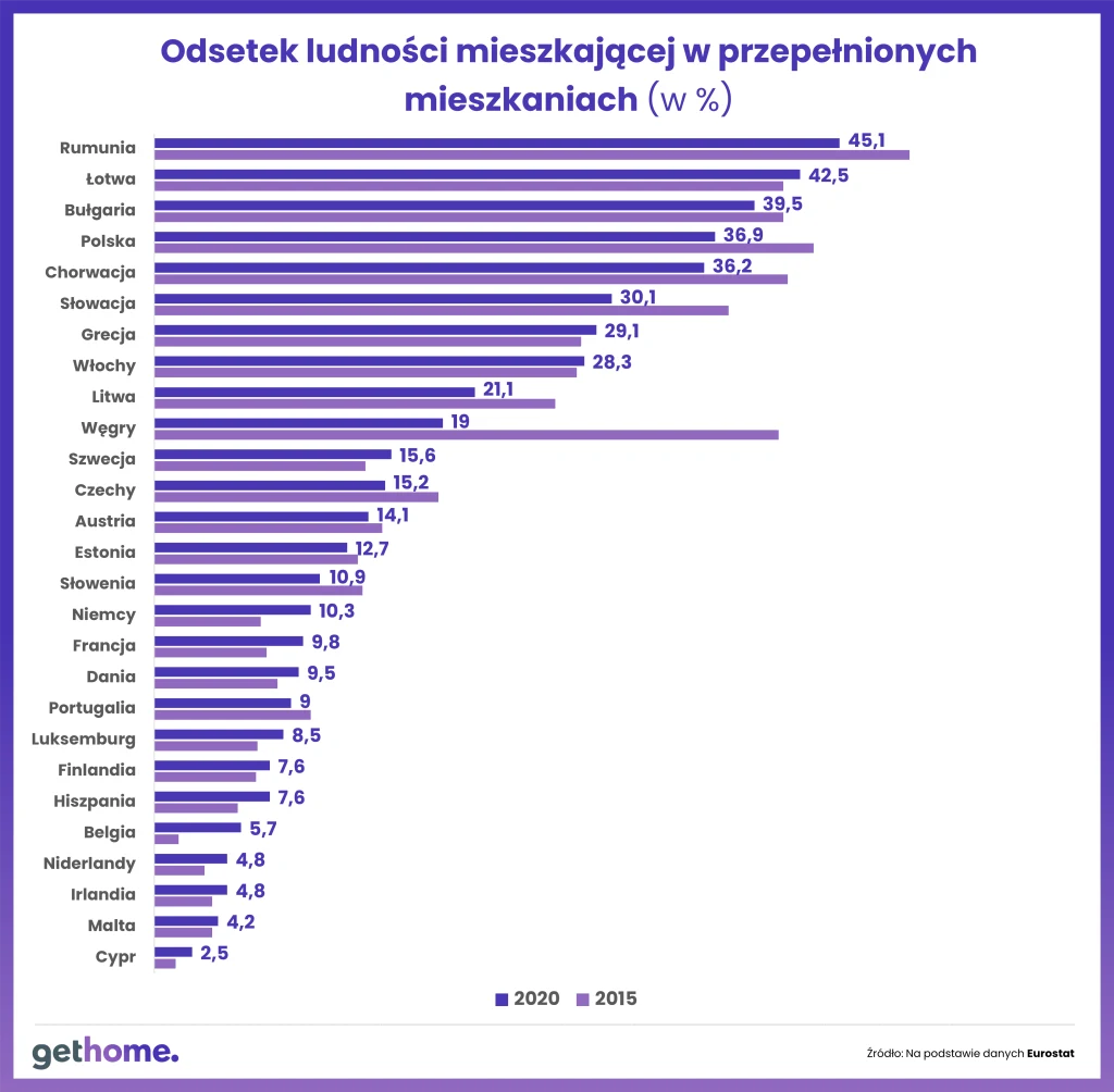 - Od 2015 r. warunki mieszkaniowe w naszym kraju nieco się poprawiły, wtedy na osobę przypadało 1,1 pokoju. Problem w tym, że wciąż dzieli nas ogromny dystans do unijnej czołówki. W naszym regionie najszybciej doganiały ją Węgry, gdzie Eurostat odnotował wzrost liczby pokoi na osobę z 1,2 do 1,5 - komentuje ekspert GetHome.pl.