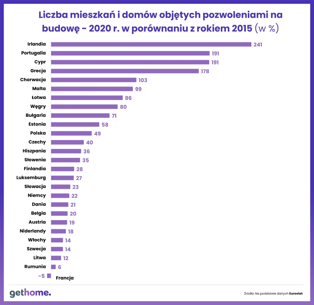 Są też jednak statystyki, które stawiają nasze kraj w europejskiej czołówce. Szczególnie dumni możemy być z wyników budownictwa mieszkaniowego. Przy czym słabo pokazują to dane Eurostatu dotyczące pozwoleń na budowę. Np. w Polsce liczba objętych nimi mieszkań i domów była w 2020 r. o 49 proc. wyższa niż pięć lat wcześniej. O wiele większe wrażenie robi ten wskaźnik dla Irlandii.