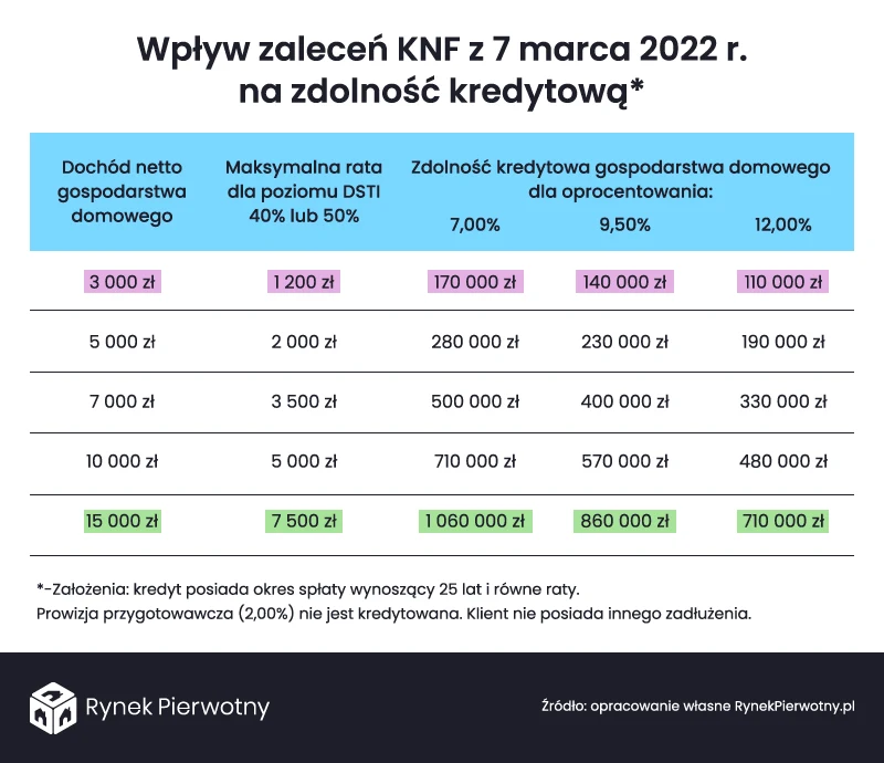 Poniższa tabela przedstawia szacunki bezpiecznej zdolności kredytowej dla gospodarstw domowych o różnym poziomie dochodu netto (od 3000 zł miesięcznie do 15 000 zł). Te wyliczenia wykonano uwzględniając limit wskaźnika DSTI oraz dwa możliwe bufory dotyczące wzrostu oprocentowania (z 7,00 proc. do 9,50 proc. - o 2,50 punktu procentowego oraz z 7,00 proc. do 12,00 proc. - o 5,00 p.p.). Wyniki obliczeń potwierdzają, że już same wcześniejsze podwyżki stóp procentowych NBP bardzo mocno ograniczyły zdolność kredytową. Przy oprocentowaniu 7,00 proc., osoba lub rodzina z dochodem 5000 zł netto, bezpiecznie może pożyczyć 280 000 zł lub 230 000 zł (z buforem 2,50 p.p.). Zastosowanie nowego bufora na poziomie 5,00 punktów procentowych oznacza spadek zdolności kredytowej do 190 000 zł.