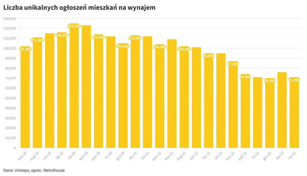 Napływ uchodźców pojawił się w momencie, gdy rynek najmu mieszkań w Polsce charakteryzował się niższą, w porównaniu z poprzednimi okresami, podażą mieszkań. - Z naszych analiz wynika, że na koniec lutego br. w całej Polsce dostępnych było ok. 70 000 mieszkań do wynajęcia. Mówimy tutaj o aktualnych, unikalnych ofertach wynajmu. Jeszcze rok temu było to ponad 110 000 mieszkań. Wtedy jednak studenci, czyli bardzo liczna grupa na rynku najmu, byli - ze względu na obostrzenia epidemiologiczne - wyjątkowo mało aktywni. To zmieniło się po wakacjach i można śmiało zaryzykować hipotezę, że to właśnie oni uszczuplili dostępną na rynku ofertę o ok. 40 000 lokali - komentuje Bartłomiej Głuchowski, twórca narzędzia dla pośredników Unirepo. Ile mieszkań będzie dostępnych po napłynięciu pierwszej fali uchodźców z Ukrainy? - Na dane musimy poczekać do końca marca, ale przewidujemy, że liczba ta nas zaskoczy.