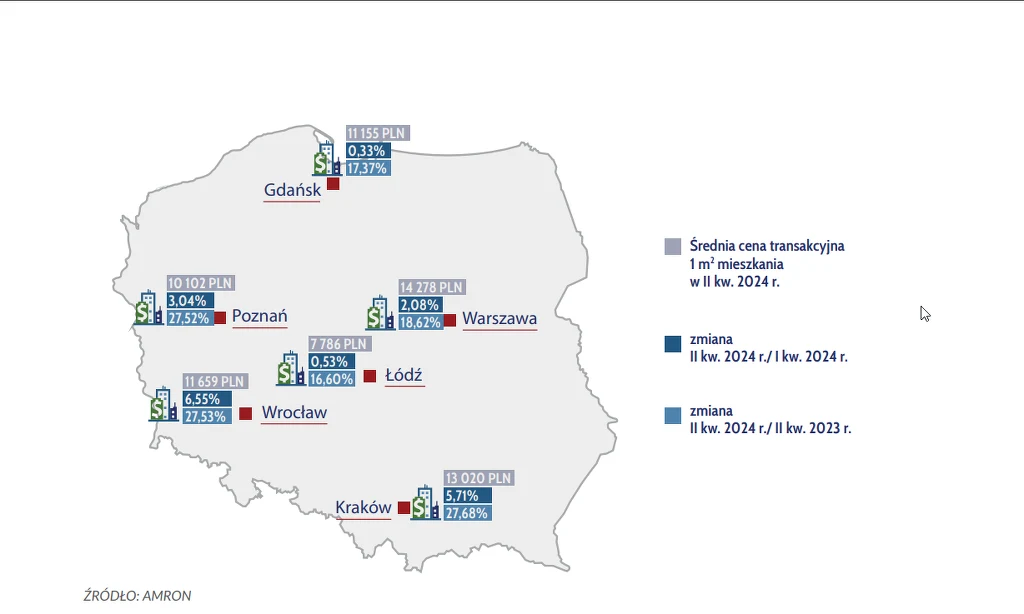 Patrząc na największe miasta, to w drugim kwartale mieszkania zdrożały najmocniej właśnie we Wrocławiu - o 6,55 proc. oraz w Krakowie - o 5,71 proc. Średnia cena transakcyjna w Poznaniu wzrosła o 3 proc. a w Warszawie tylko o 2 proc. w porównaniu do I kwartału 2024 roku. W pozostałych badanych miastach wzrosty cen nie przekroczyły 1 proc. Niektórzy analitycy rynku mieszkaniowego wieszczą nawet nadchodzący spadek cen mieszkań. Na razie jednak obniżki dotyczą jedynie cen ofertowych.