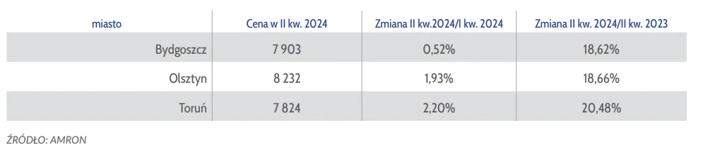 Jak wygląda sytuacja w mniejszych miastach? Przykładowo, w porównaniu z I kwartałem 2024 roku w Toruniu - był wzrost o 2,2 proc., w Bydgoszczy o 0,5 proc., a w Olsztynie 1,9 proc. Rocznie w Toruniu mieszkania zdrożały o 20 proc., a w Bydgoszczy i Olsztynie o ponad 18 proc.