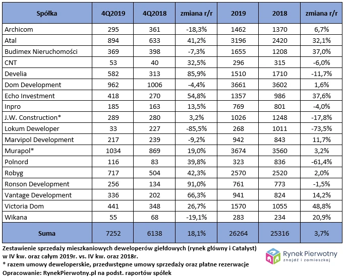 Zaprezentowana osiemnastka czołowych firm krajowej branży deweloperskiej o profilu mieszkaniowym, spółek notowanych na rynku podstawowym oraz Catalyst warszawskiej GPW, w ostatnim kwartale ub. roku zakontraktowała w sumie 7252 lokale, co jest wynikiem o ponad 18 proc. lepszym od osiągniętego w analogicznym okresie 2018 roku, jednocześnie zaledwie o 8 procent gorszym od rekordowego IV kw. 2017 r.