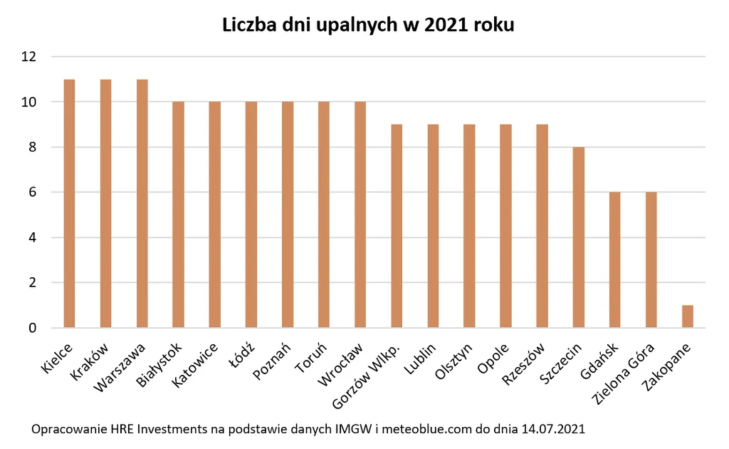 W ostatnich dniach z najgorszymi upałami mierzą się mieszkańcy Kielc, Krakowa i Warszawy. Do 14 lipca 2021 roku dni upalnych było tam aż 11. To znaczy, że termometry wskazywały co najmniej 30 kresek. Co prawda mieszkańcy tych miast są już wprawieni w walce z wysoką temperaturą, ale przecież jesteśmy dopiero na początku sezonu letniego. W rekordowych latach (2006 i 2015) upalnych dni było od 20 do 30. Jesteśmy więc na dobrej drodze do tego rekordu.