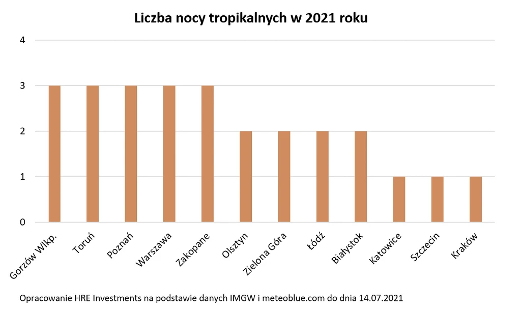 W bieżącym roku najczęściej z takim zjawiskiem mierzyli się mieszkańcy Gorzowa Wielkopolskiego, Torunia, Poznania oraz Warszawy. W sezonie letnim 2021 pojawiły się tam już 3 takie noce. Dalej plasują się Olsztyn, Zielona Góra, Łódź, Białystok - po 2 noce tropikalne oraz Katowice, Szczecin, Kraków - po 1 nocy. Znowu może dziwić obecność Zakopanego w tym zestawieniu - w mieście tym przez ostatnich 60 lat noc tropikalna wystąpiła jedynie 5 razy, a w bieżącym sezonie zjawisko to nawiedziło stolicę Tatr już dwa razy.