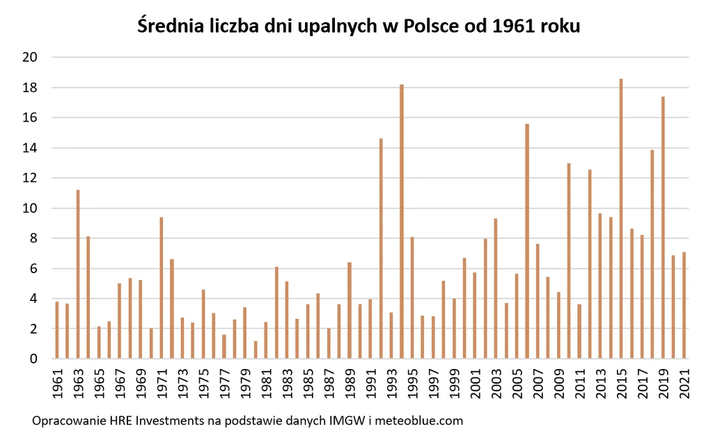 Upały to oczywiście zjawisko znane, z którymi Polacy mierzą się od wielu lat. Jednak warto zauważyć, że od lat 90-tych jest coraz gorzej. Jak podają naukowcy przykładowo w okresie od roku 1951 do 1990 średnio w całym kraju (83 punkty pomiarowe) mieliśmy 4 dni upalne w ciągu roku. Prawie 20 lat później - 2009 do 2018 liczba dni upalnych zwiększyła się z 4 do 10 rocznie! W roku 2021 póki co mieliśmy w naszym kraju średnio 7 takich dni.